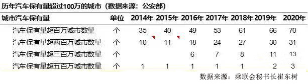 从各大城市的汽车保有量来看,由于全国新车销量的持续走跌,2020年新增的保有量超过100万辆的城市为70个,仅比去年同期增加4个,同时超200万辆的城市只新增1个,与此前相比增速明显放缓。