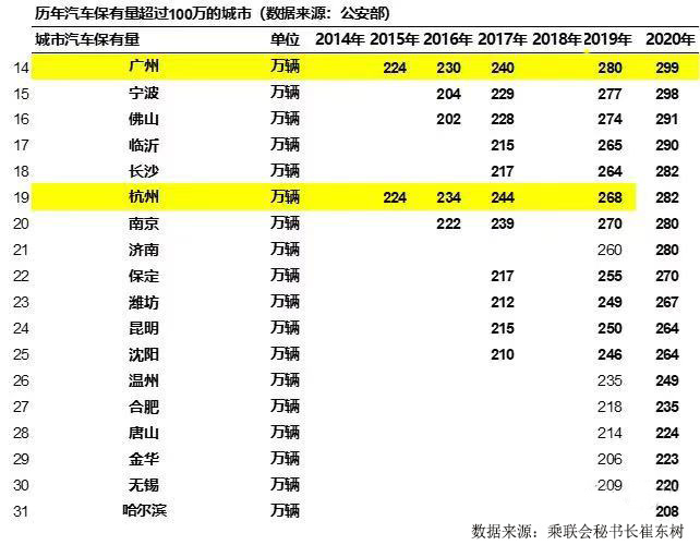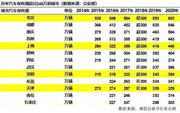 根据乘联会秘书长崔东树整理的数据,在2016年至2019年期间,前3年汽车保有量超300万辆的城市每年只新增1个,经过多年的努力之后2019年这一数字才有机会扩大至3个。而在2018年及之前全国有且仅有北京的汽车保有量超过500万辆,直到2019年成都才成为我国第二个跨过这一门槛的城市。