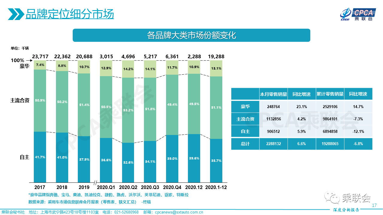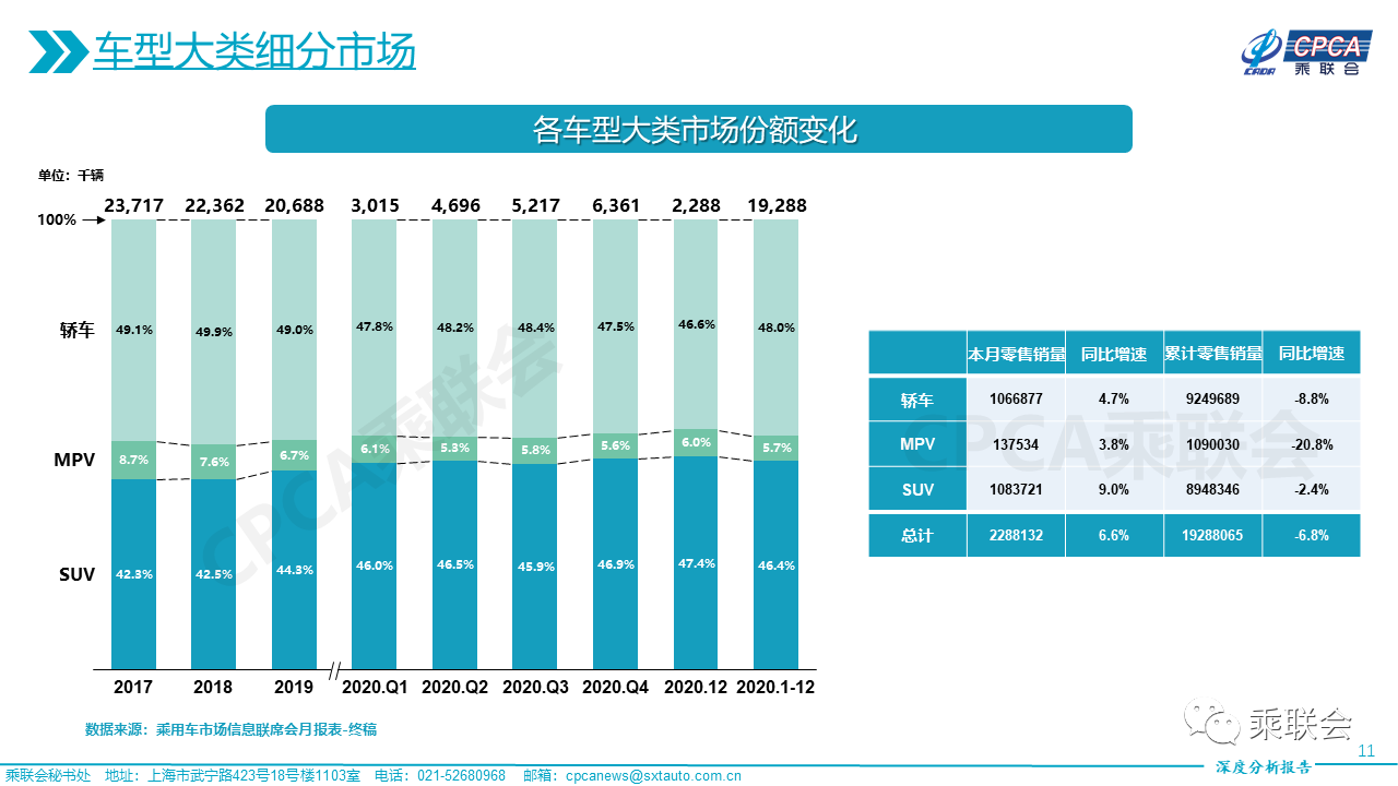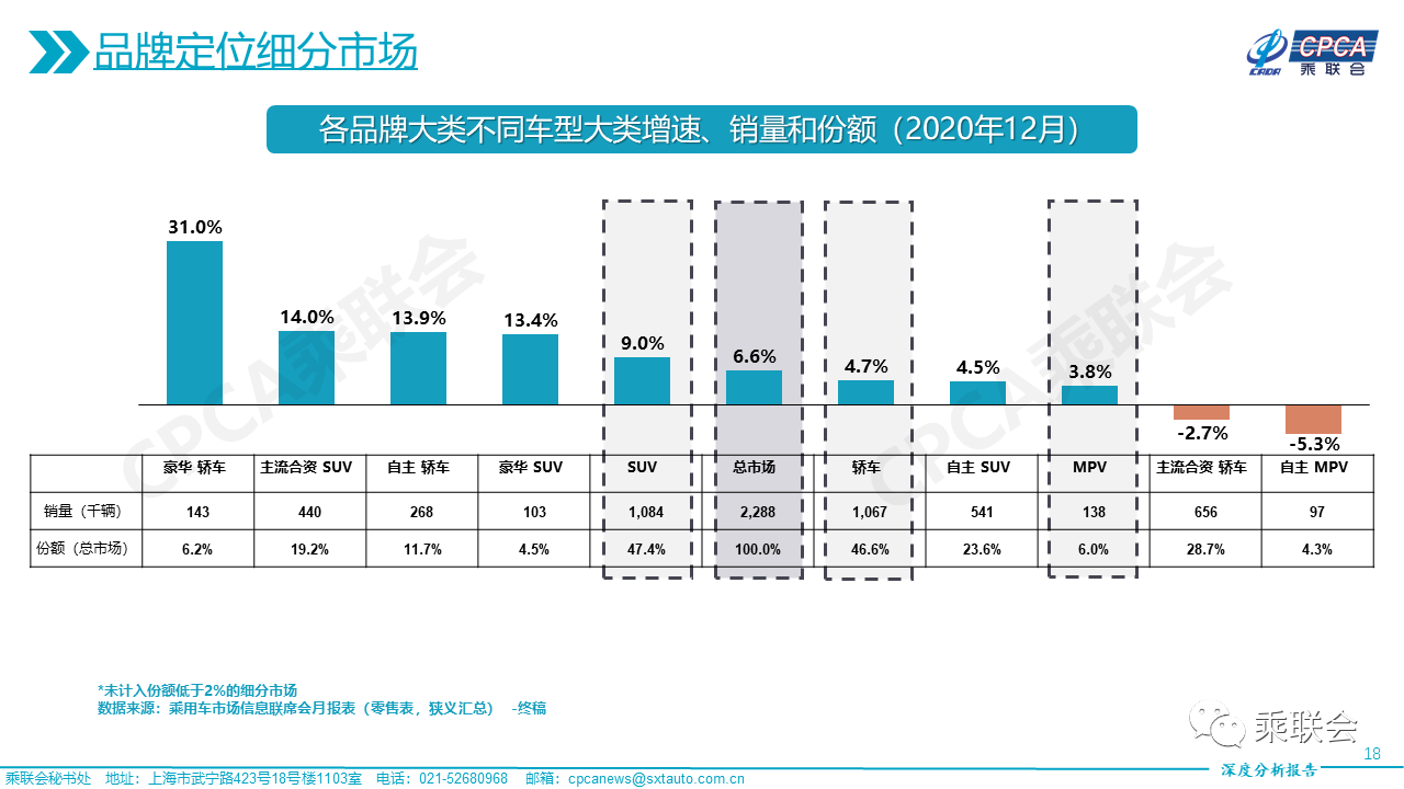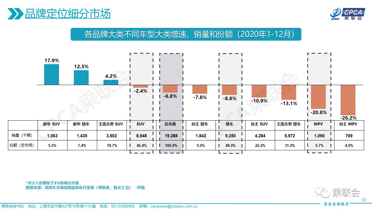 各品牌大类下不同车型大类增速、销量和份额——2020年12月及累计