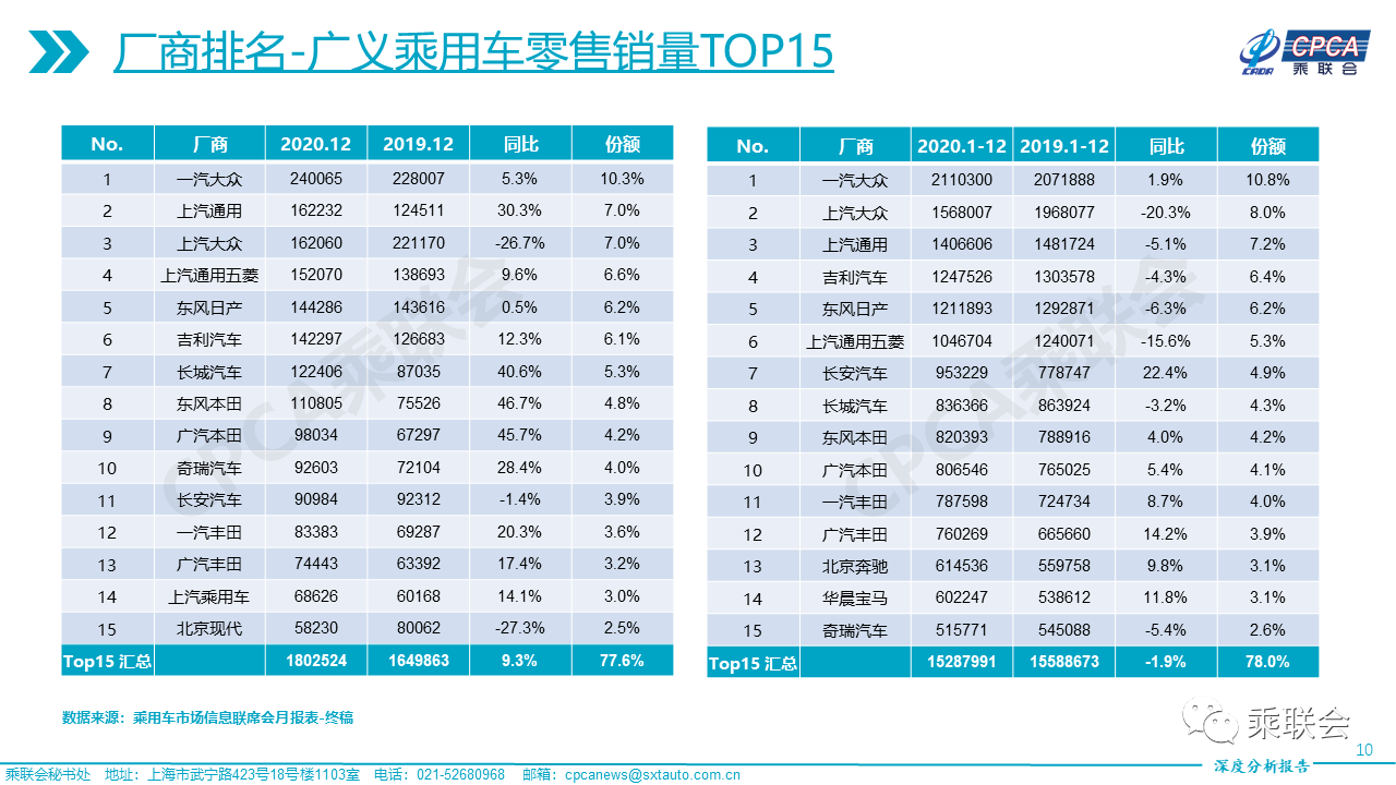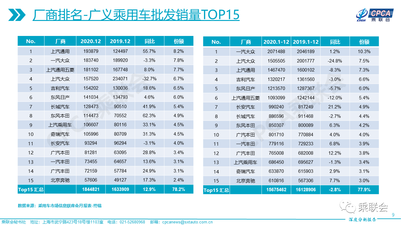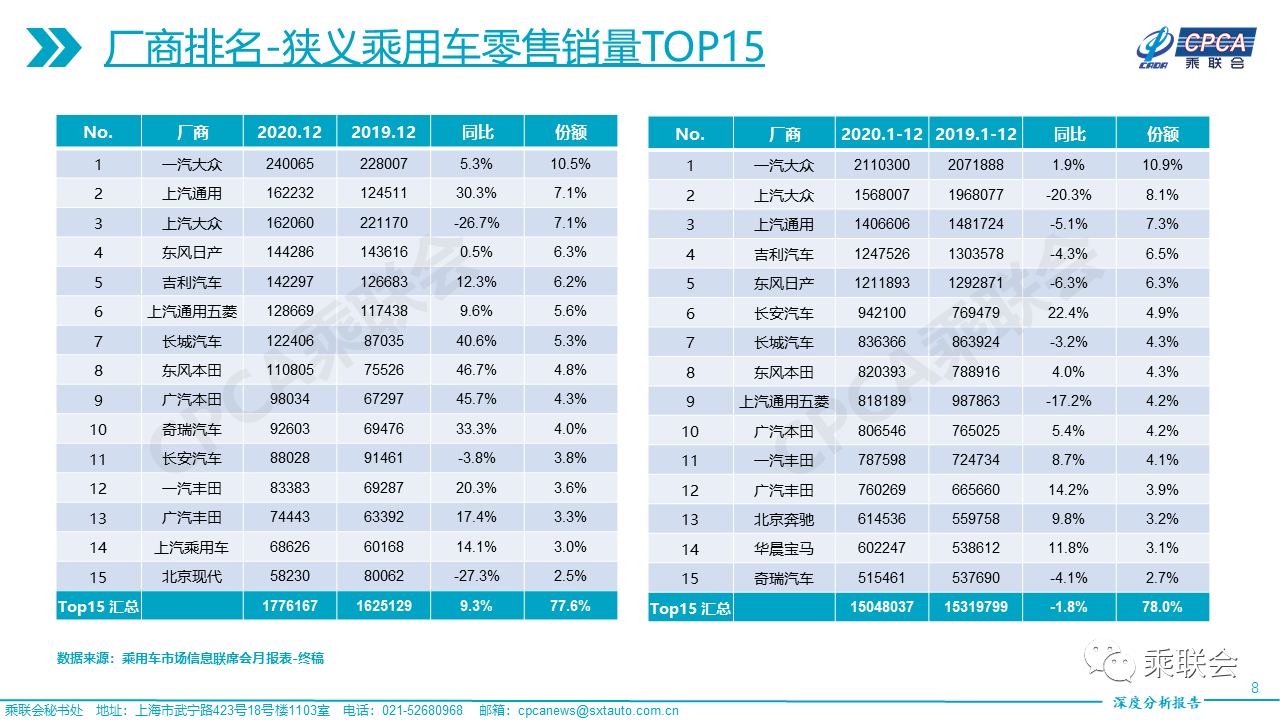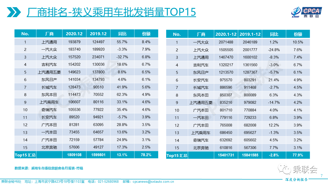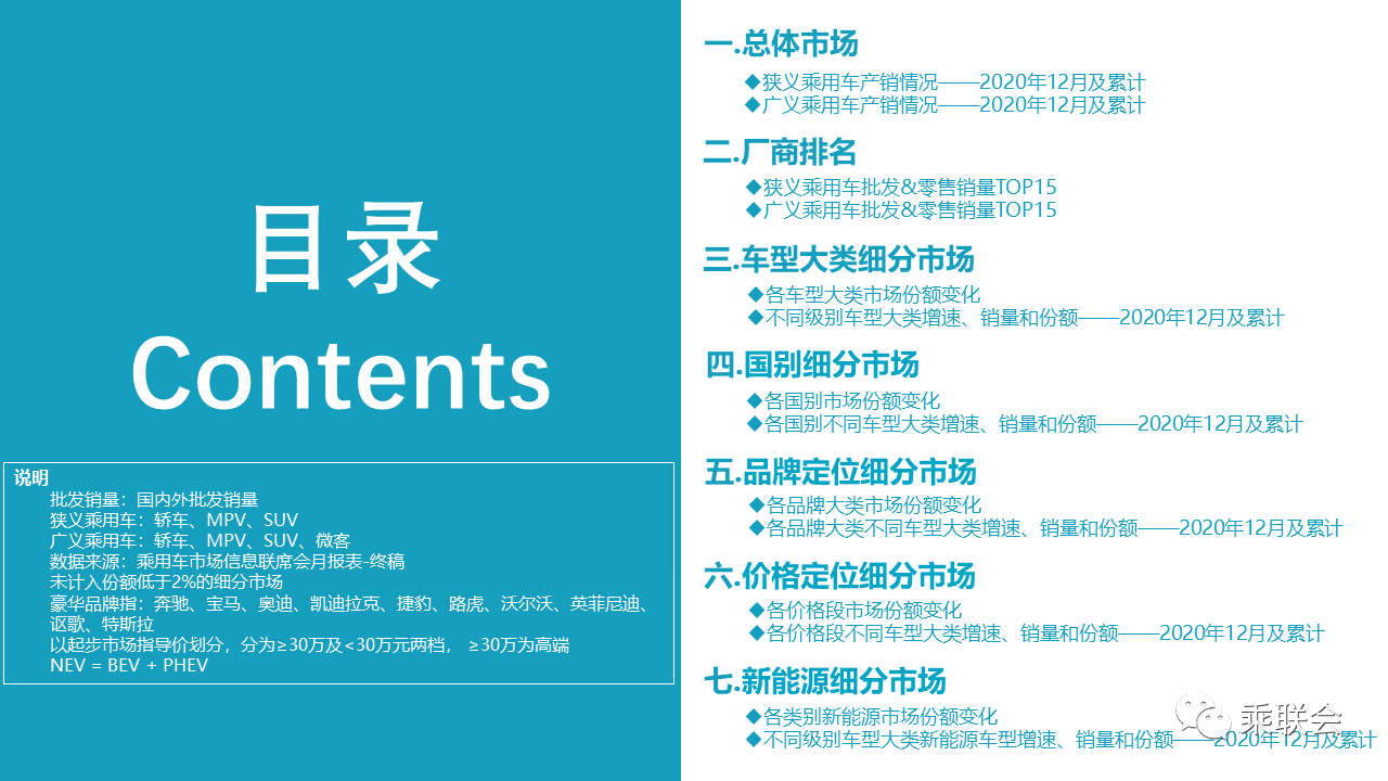 各品牌大类下不同车型大类增速、销量和份额——2020年12月及累计