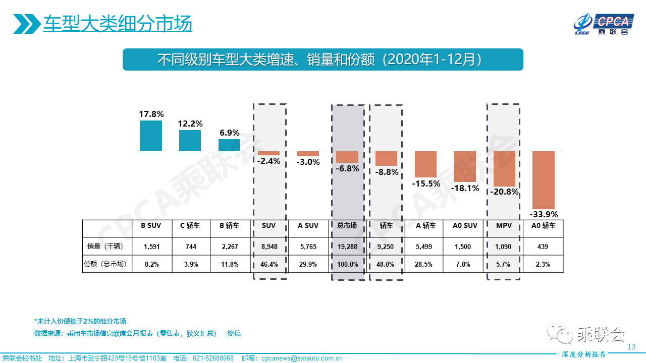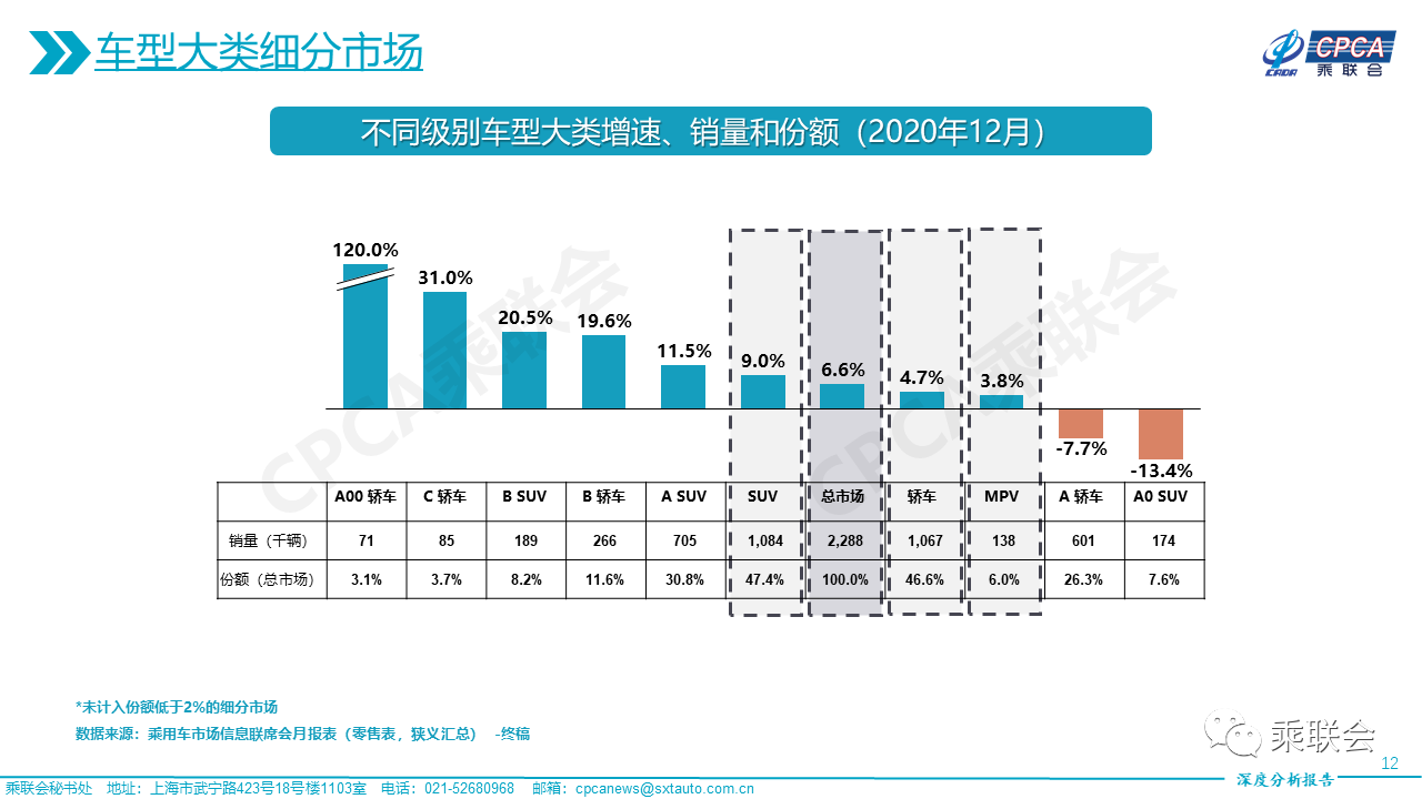 不同级别车型大类增速、销量和份额——2020年12月及累计