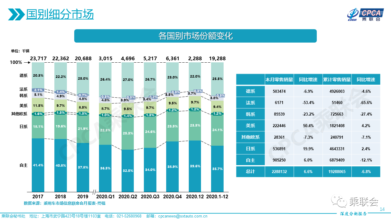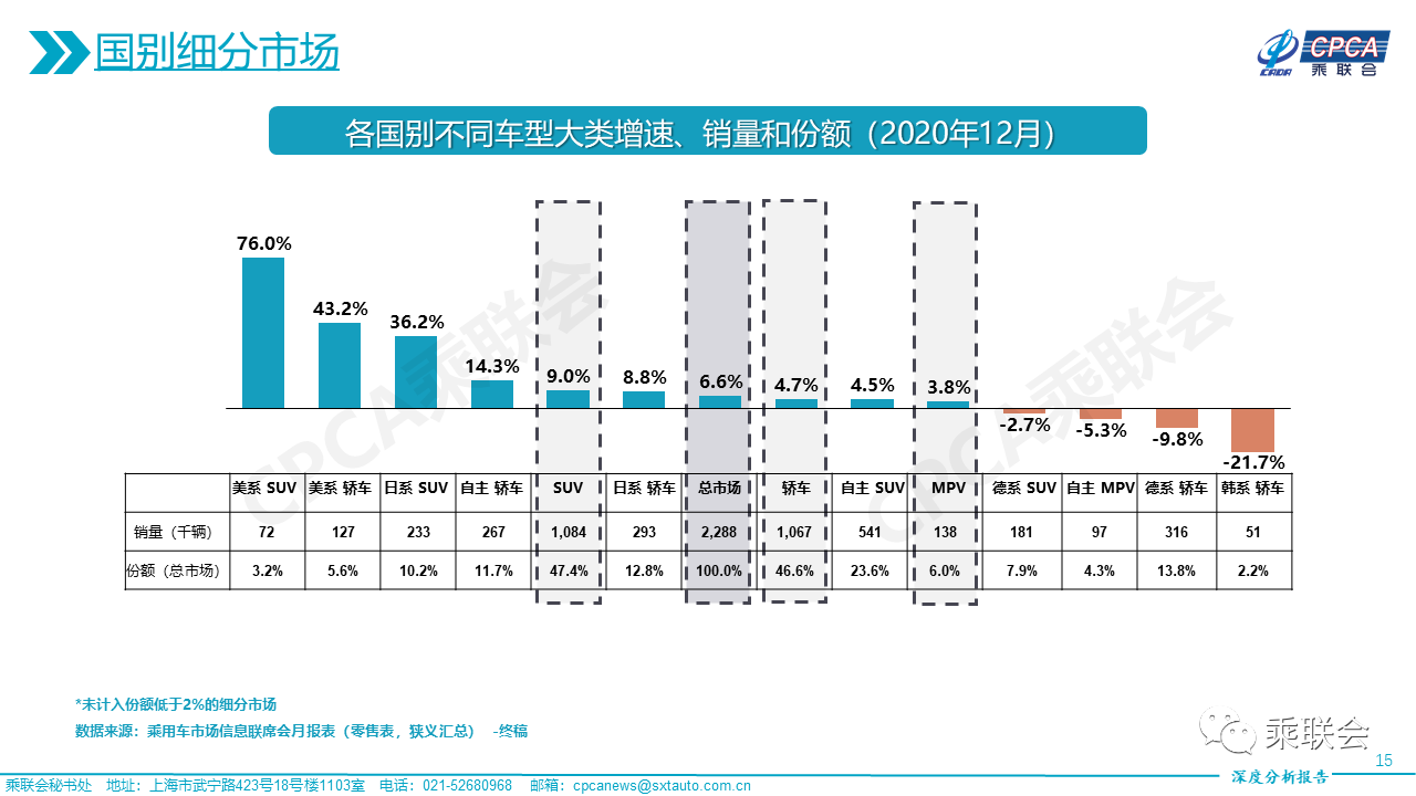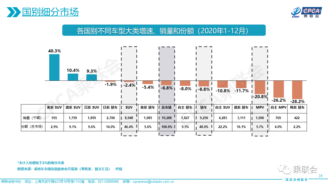 各国别不同车型大类增速、销量和份额——2020年12月及累计