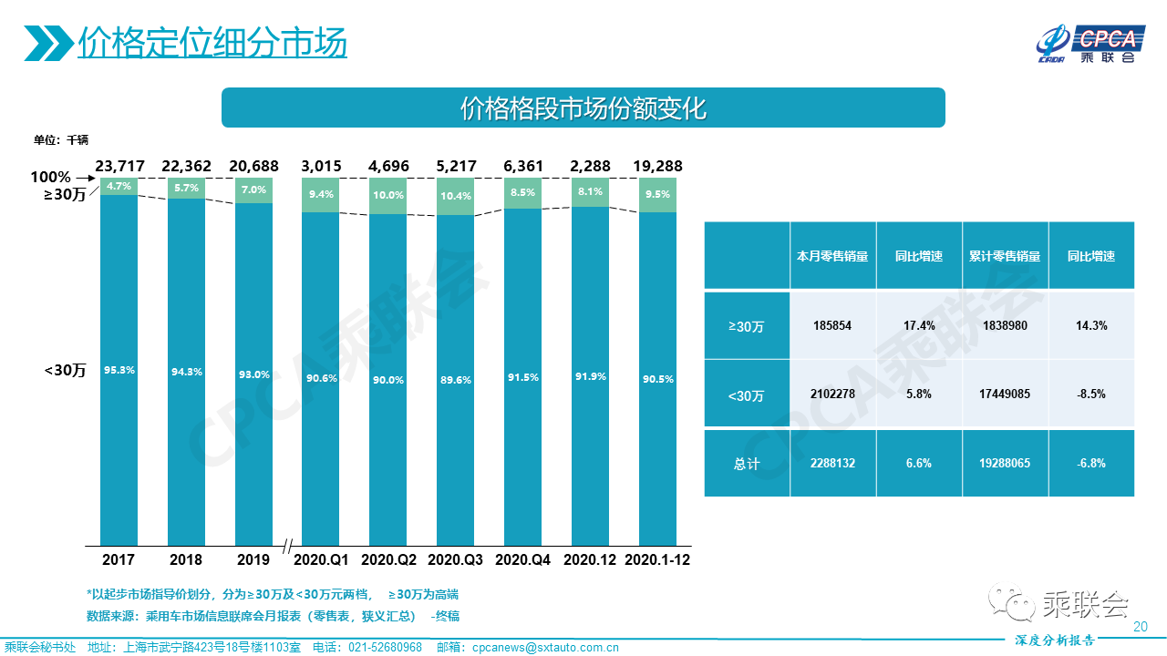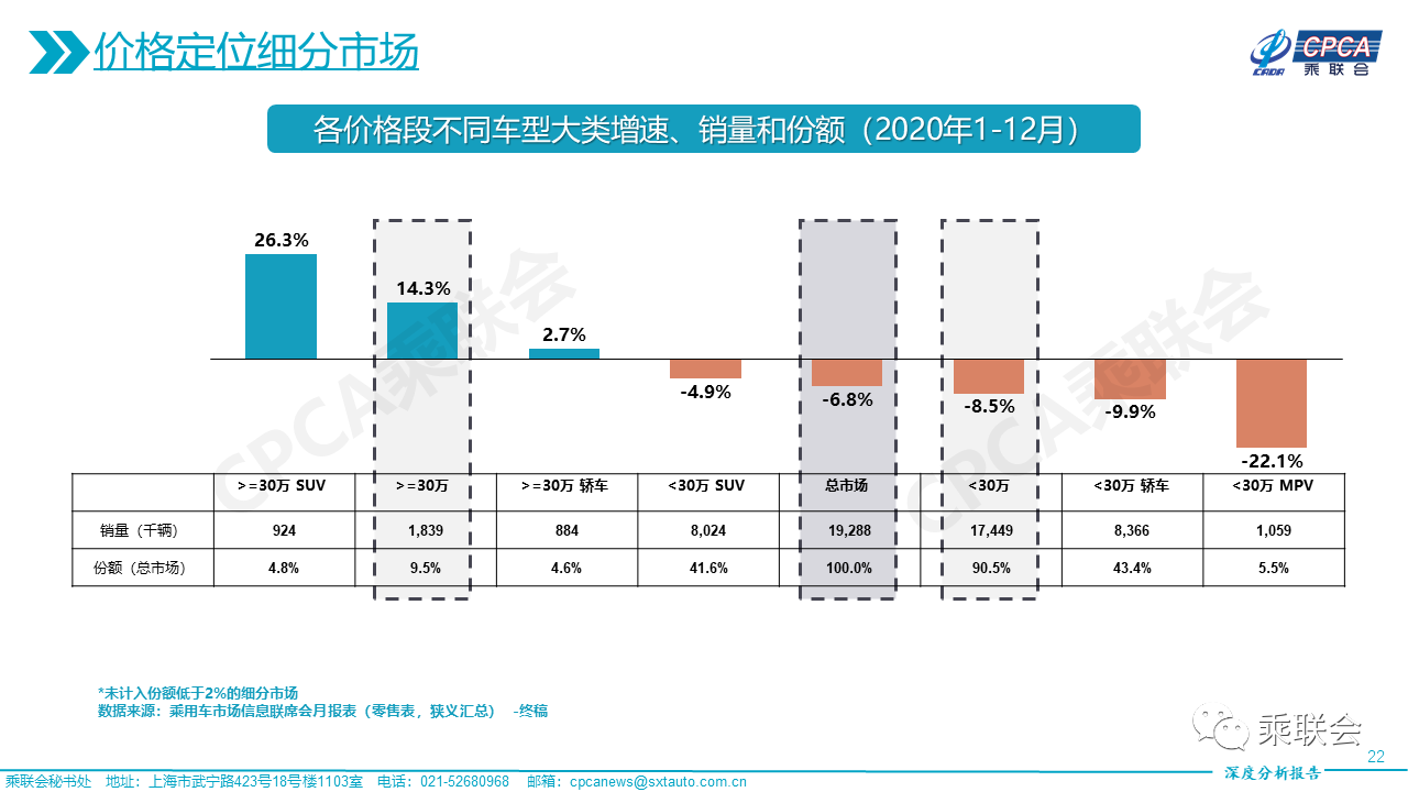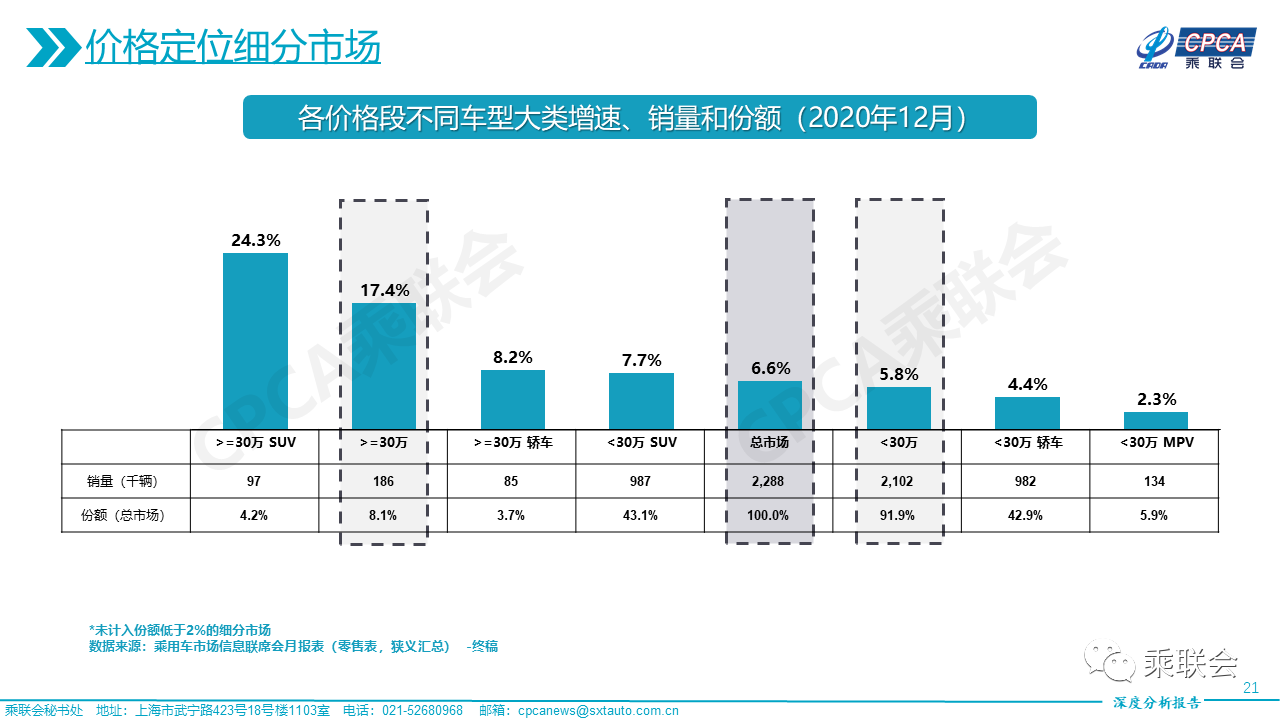 各价格段不同车型大类增速、销量和份额——2020年12月及累计