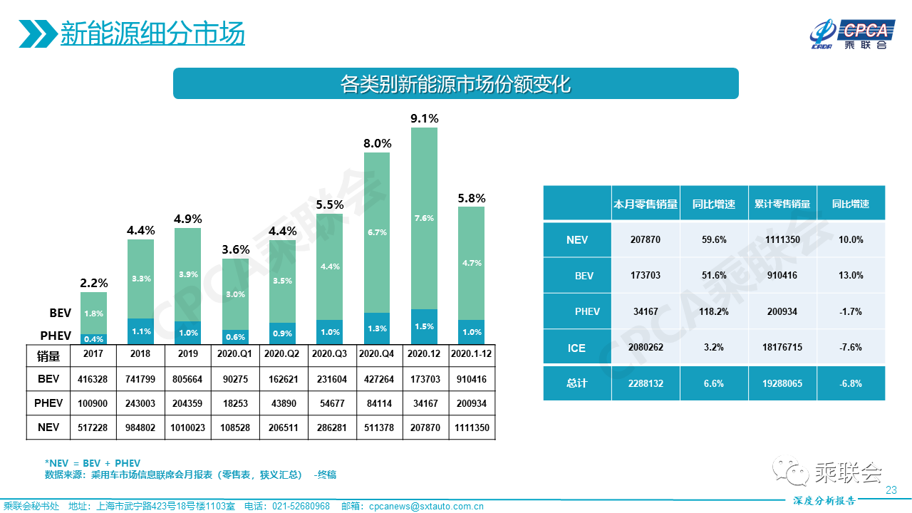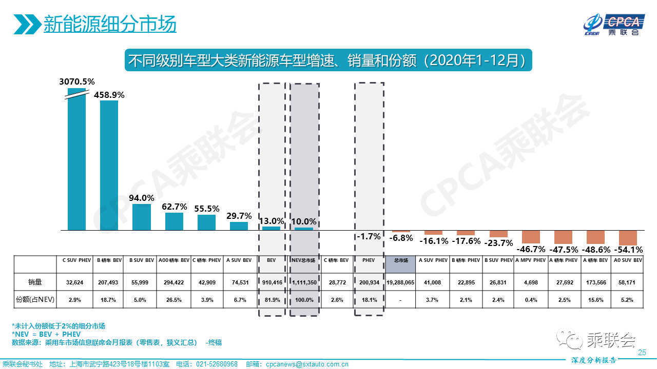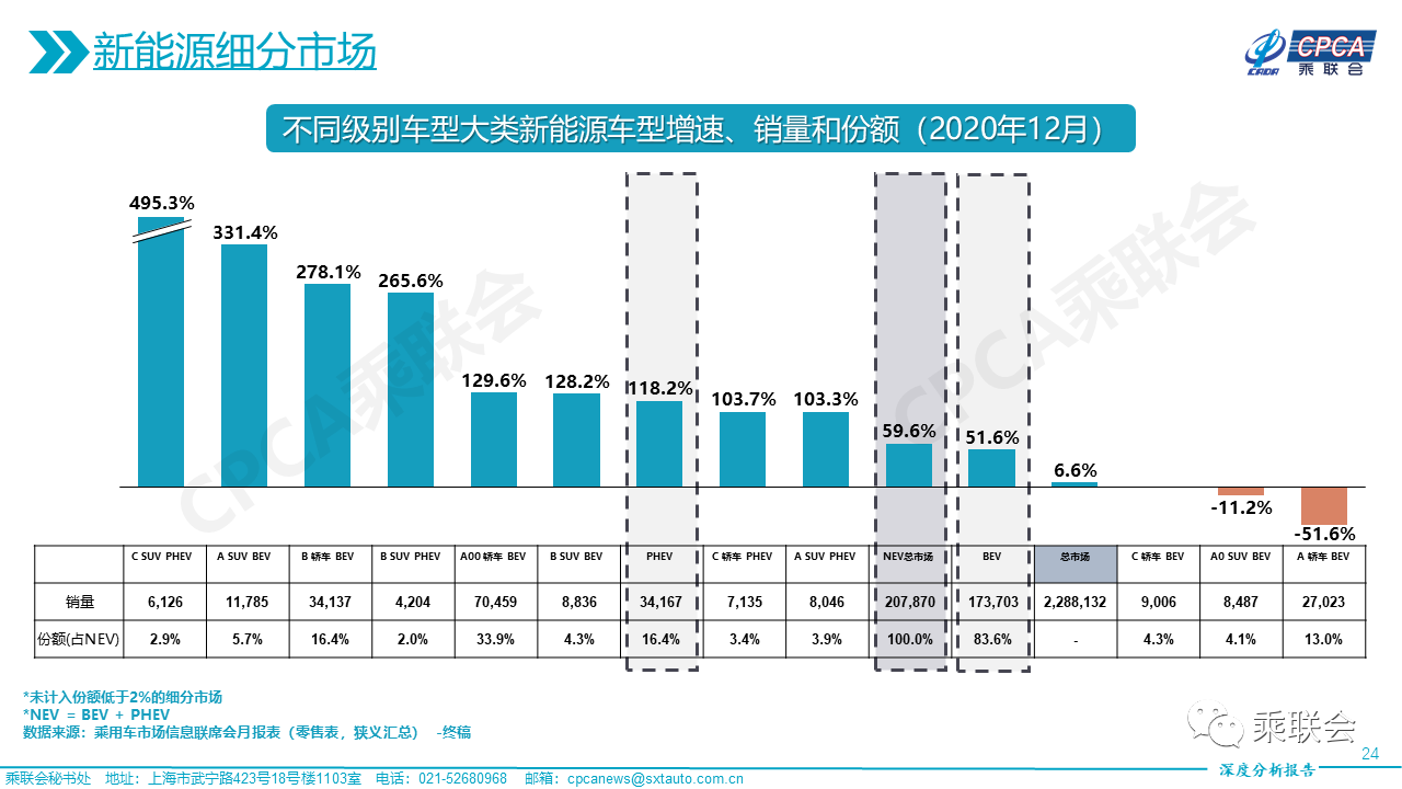 不同级别车型大类新能源车型增速、销量和份额——2020年12月及累计