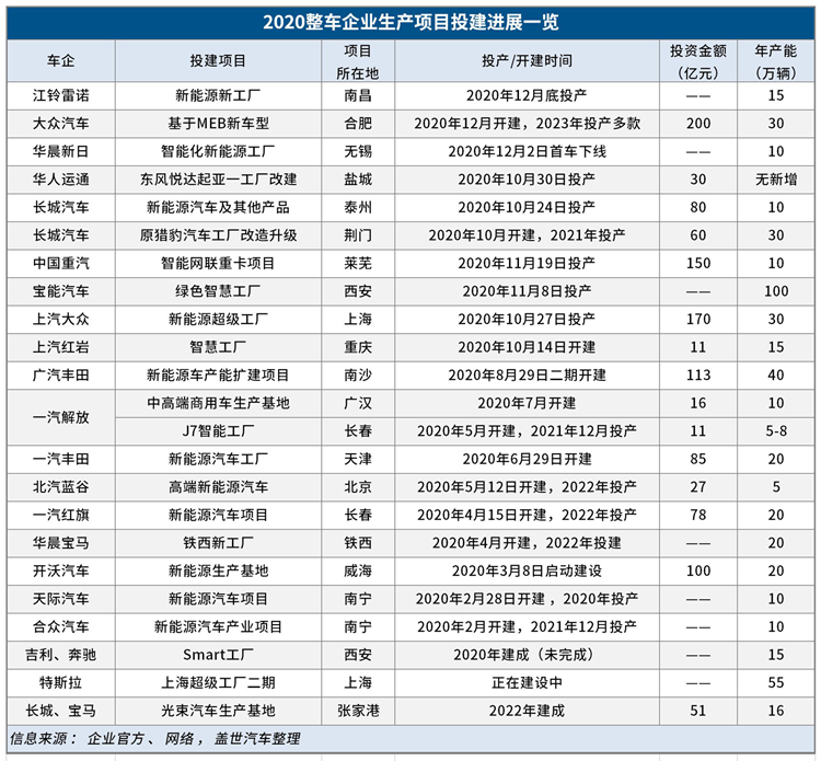 据盖世汽车整理,2020年,全国至少有23个新汽车工厂正式投产或启动建设,涉及产能高达499万辆。