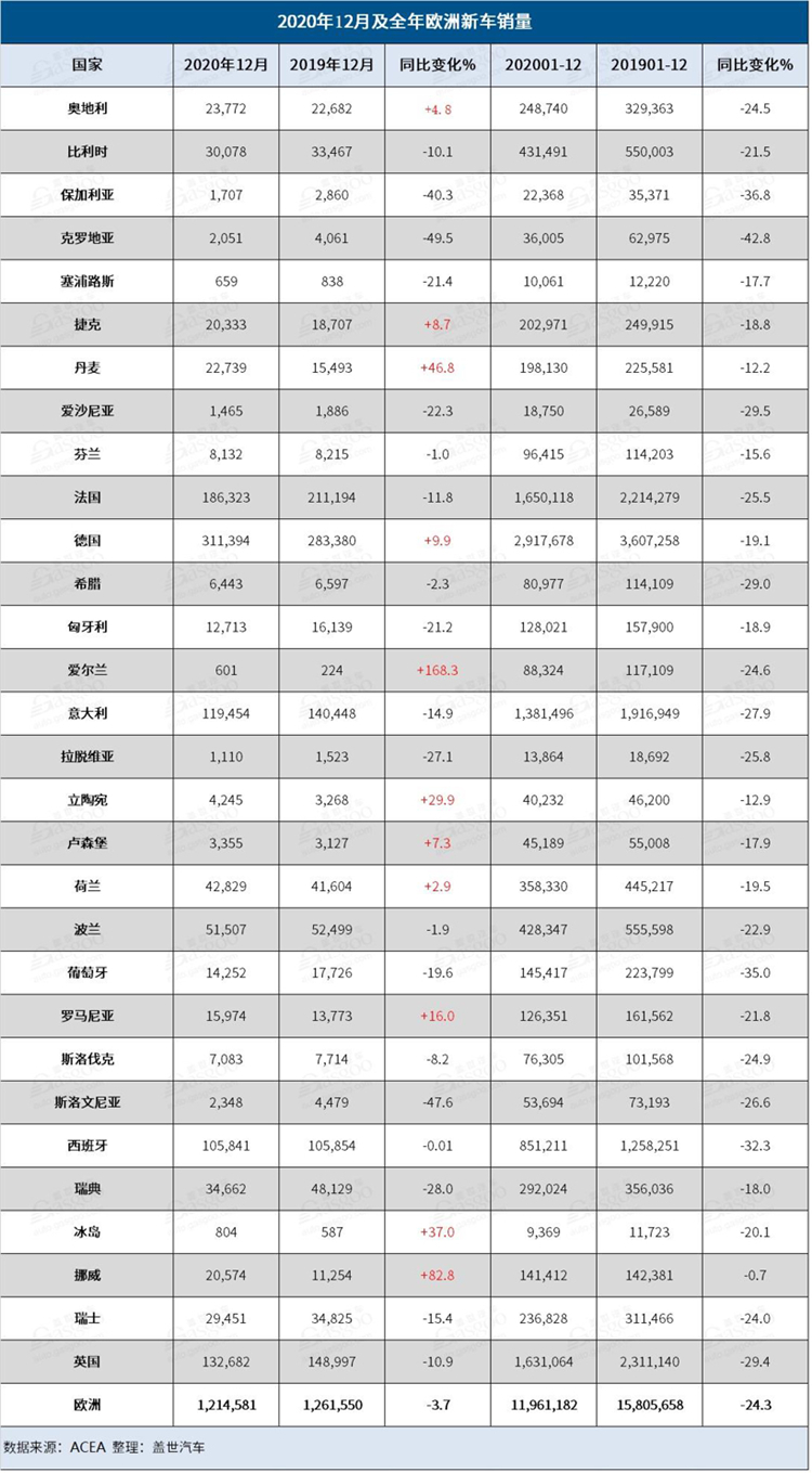 1月19日,欧洲汽车制造商协会(ACEA)正式公布该地区2020年汽车销量数据。其中去年12月,欧洲新车销量同比下跌3.7%,至121万辆,由于各国为抑制第二波疫情采取了封锁措施,打击了大多数汽车市场的销量,这已是欧洲汽车销量连续第三个月下降;2020年全年汽车销量同比下滑24.3%,至1,196万辆,创1990年有记录以来最大年度跌幅。