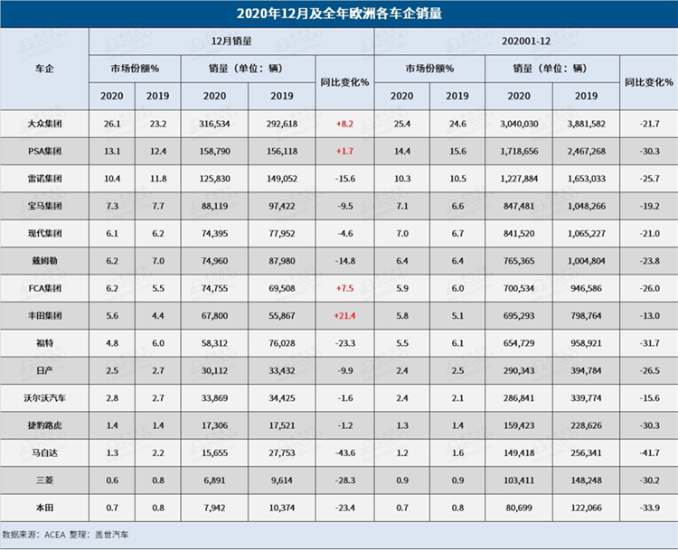 就车企销量表现来看,可谓是“有人欢喜有人忧”。大众集团和PSA集团在2020年末的强劲销量帮助部分抵消了去年12月的行业销量低迷。