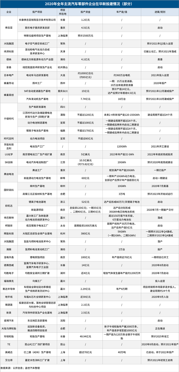 除了前文重点提及的LG化学、日本电产、大陆、伟巴斯特之外,宁德时代、国轩高科、辉能科技等零部件企业的投资也均聚焦于新能源汽车领域,尤其是在电池的产能储备上。