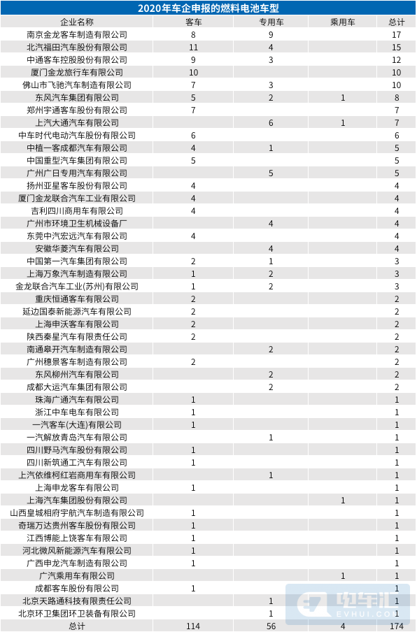 据电车汇统计,2020年有47家整车企业共计申报了174款氢燃料电池车型,其中客车114款,专用车56款,乘用车4款。而2020年全年燃料电池客车销量为1214辆,专用车146辆,并未真正实现规模化运营。