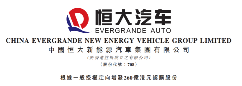 1月24日,恒大汽车(0708.HK)发布公告称,公司按前5个交易日平均收盘价折让8%的价格向6名投资人定向增发9.52亿股新股,共引资260亿港元,各投资方自愿锁定12个月。