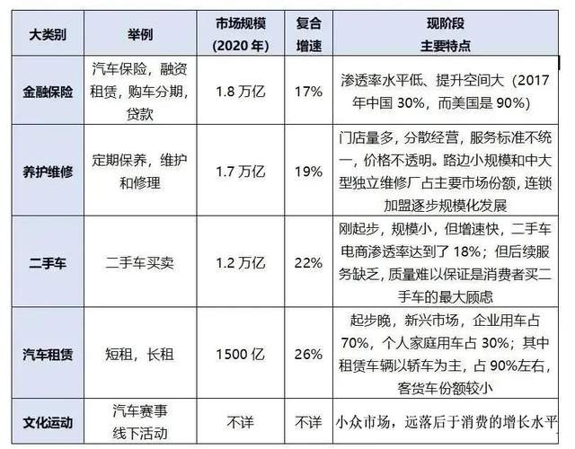 广义上,汽车后市场是指在汽车售出到车辆报废过程中,围绕汽车使用的所有交易和服务,通常可分为如下表所示的五大类别:
