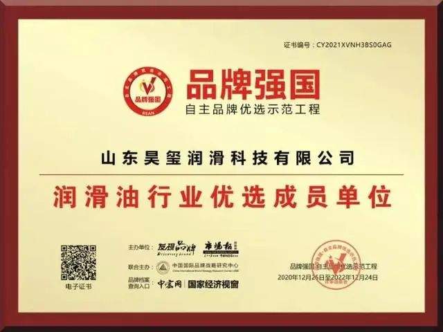 近日,山东昊玺润滑科技有限公司评为品牌强国工程润滑油行业优选成员单位。
