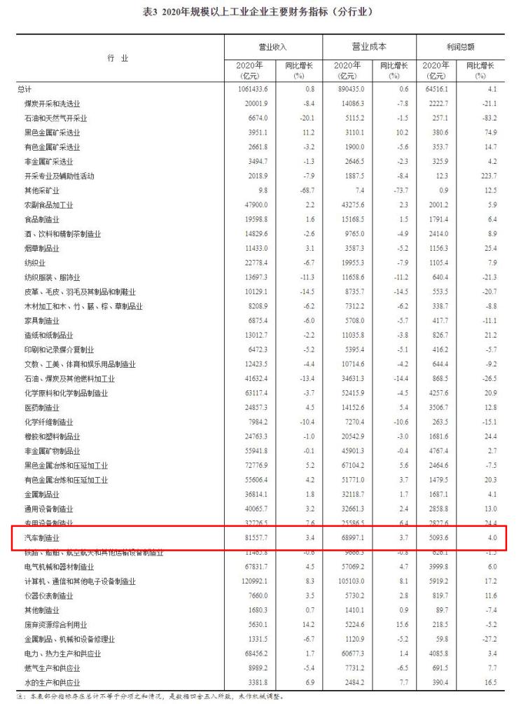 具体数据来看,汽车制造业2020年营业收入为81557.7亿元,同比增长3.4%;利润总额为5093.6亿元,同比增长4.0%。国家统计局贸易外经司司长董礼华表示,2020年下半年以来,汽车类商品零售额连续6个月保持较快增长,汽车销售市场的明显回暖对消费市场稳定复苏发挥了重要支撑作用。