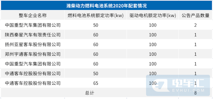 根据潍柴动力在互动平台的回复,截止去年8月份,潍柴动力已建成2万套级产能的燃料电池发动机及电堆生产线,配套潍柴动力氢燃料电池发动机的公交车已批量投放市场。据电车汇统计,2020年1-13批新能源汽车推荐目录中,中国重汽、亚星客车、中通客车、宇通客车、秦星客车申报了搭载潍柴动力氢燃料电池系统的公交车,共计8款车型。