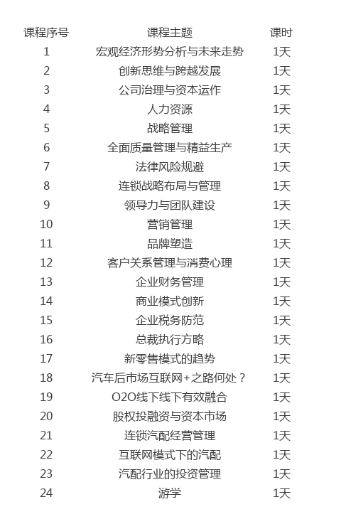 浙江大学汽车产业后市场高级研修班采用模块式课堂研讨教学与现场教学专题讨论相结合的方式进行,邀请知名管理专家、经济学家、金融大咖、国学名家、行业领先企业家,把最新管理理念和动态讲给学生,充分发挥浙江大学管理学院在创新创业、科研、技术转移、人才智库等方面的优势,为企业提供优质智力服务。