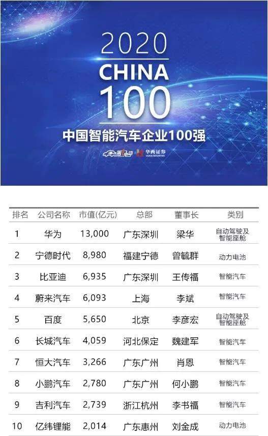 在“2020中国智能汽车企业100强”榜单中,华为、宁德时代、比亚迪位列前三。