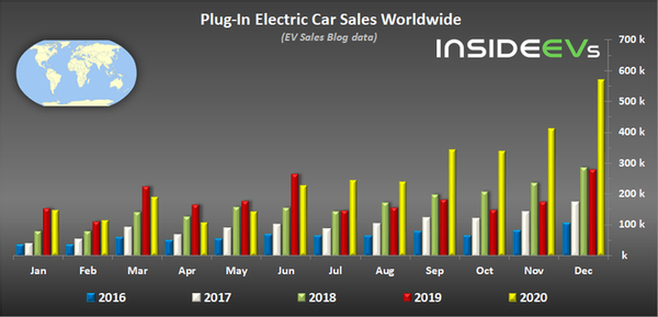 【2020年12月全球EV销量超过57万辆】