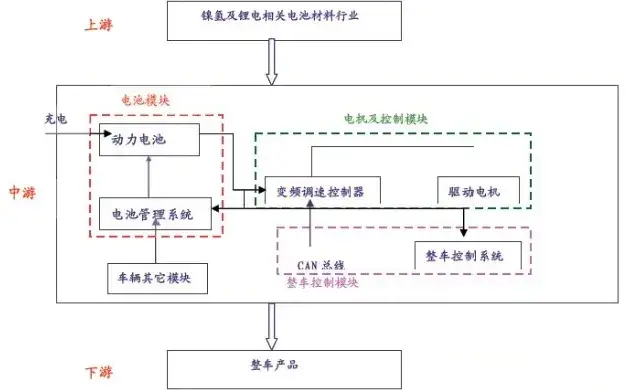 汽车电控系统行业在整个汽车产业体系中是重要的中游行业,上游承载镍氢及锂电相关电池材料行业,下游衔接汽车整车产品行业。其分别由电池模块、电机及控制模块以及整车控制模块等三大主要模块构成。其中电池模块包括动力电池和电池管理系统两部分;电机及控制模块包括变频调速控制器和驱动电机两部分;整车控制模块则包括CAN总线和整车控制系统两部分。