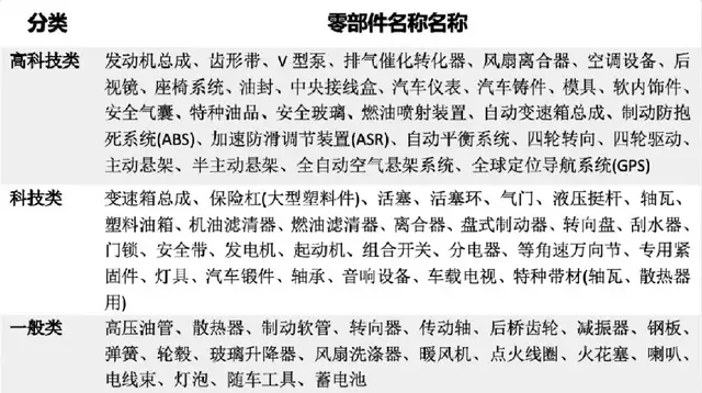 汽车零部件按科技含量分类,大致可以分为以下三类:高科技类-发动机总成、汽车仪表及汽车铸件等;科技类-变速箱总成、保险杠(大塑料件)、活塞机气门等;一般类-高压油管、散热器、制动软管及传动轴等。