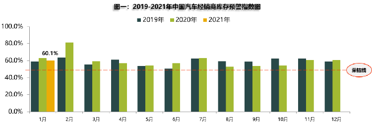 近日,中国汽车流通协会发布2021年1月“中国汽车经销商库存预警指数调查”。数据显示,2021年1月汽车经销商库存预警指数为60.1%,较上月下降0.6个百分点,较去年同期下降2.6个百分点,库存预警指数位于荣枯线之上。