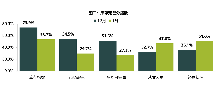 她指出,目前北方零星疫情造成客户到店和门店订单销量都有不同程度回落,对1月份的市场需求和日均销量带来比较大的影响。从区域库存指数也可以看到目前北方地区经销商库存预警指数较高,达到64.6%。