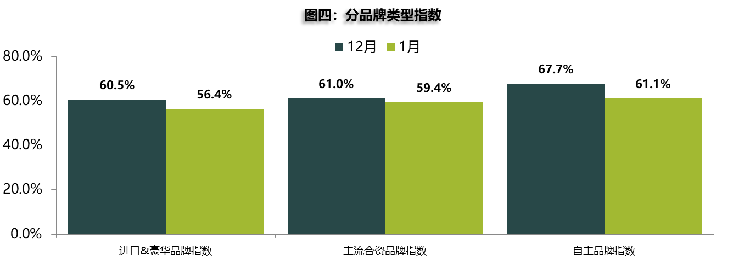 从具体分品牌库存预警指数来看,1月份进口&豪华品牌指数、自主品牌指数、主流合资品牌环比下降。郎学红指出,从1月情况看,品牌库存预警指数分化趋于收窄。由于农村居民在节前采购大件商品是比较传统的习俗,特别是外出务工人员有年底购车需求,因此促进了年底自主品牌的库存消化。