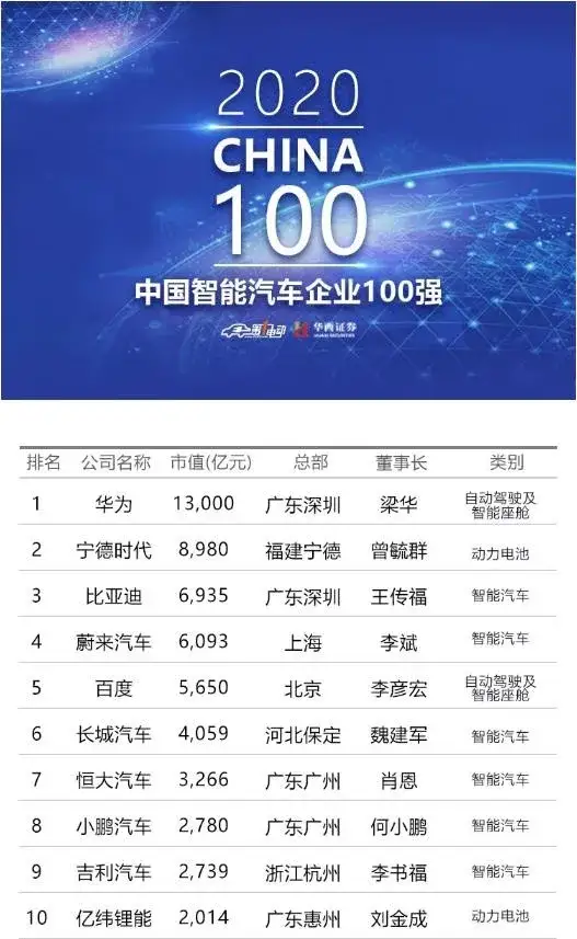 【2020中国智能汽车企业100强发布 华为、宁德时代、比亚迪位列前三】
