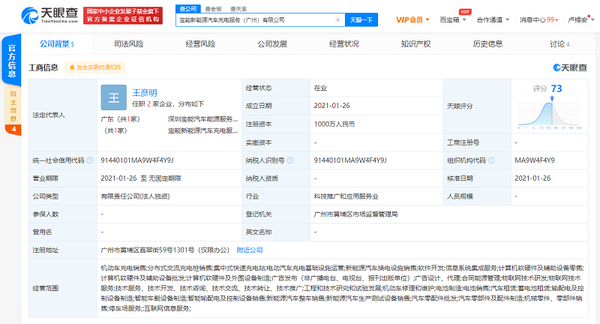 日前,从天眼查获悉,宝能新能源汽车充电服务(广州)有限公司于近日成立,新公司的法定代表人为王彦明,注册资本1000万人民币。根据天眼查公开资料显示,新公司经营范围包括机动车充电销售;分布式交流充电桩销售;集中式快速充电站;电动汽车充电基础设施运营;新能源汽车换电设施销售;软件开发;物联网技术研发;物联网技术服务;新能源汽车整车销售;汽车零配件批发等。