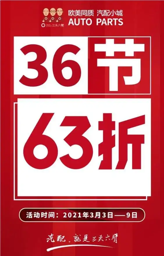 有着“汽配业双11”美誉的「36节」就要开始了,今年的三头六臂「36节」将继续秉承让利修理厂原则,优惠63折起步,不设让利上限,金额预算超亿!优惠时间:2021年3月3日-9日。
