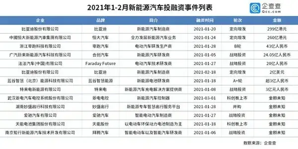 2020年结束后,新能源汽车行业的热度仍在持续。据企查查数据显示,截止到2月23日,今年以来,我国新能源汽车行业已经发生13起投融资事件,主要涉及到的企业包括比亚迪、恒大汽车、零跑汽车、合创汽车、法拉第未来等。