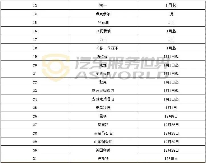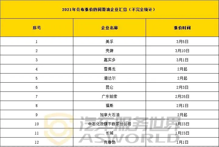 另外,开年润滑油头部企业也进行了一场集体涨价发声,美嘉壳、雪佛龙、福斯、道达尔、统一、龙蟠、3M、长城汽车(02333)、突破、昆仑等国内外知名润滑油企业30多家发布了涨价通知函,涨幅在8%-12%。