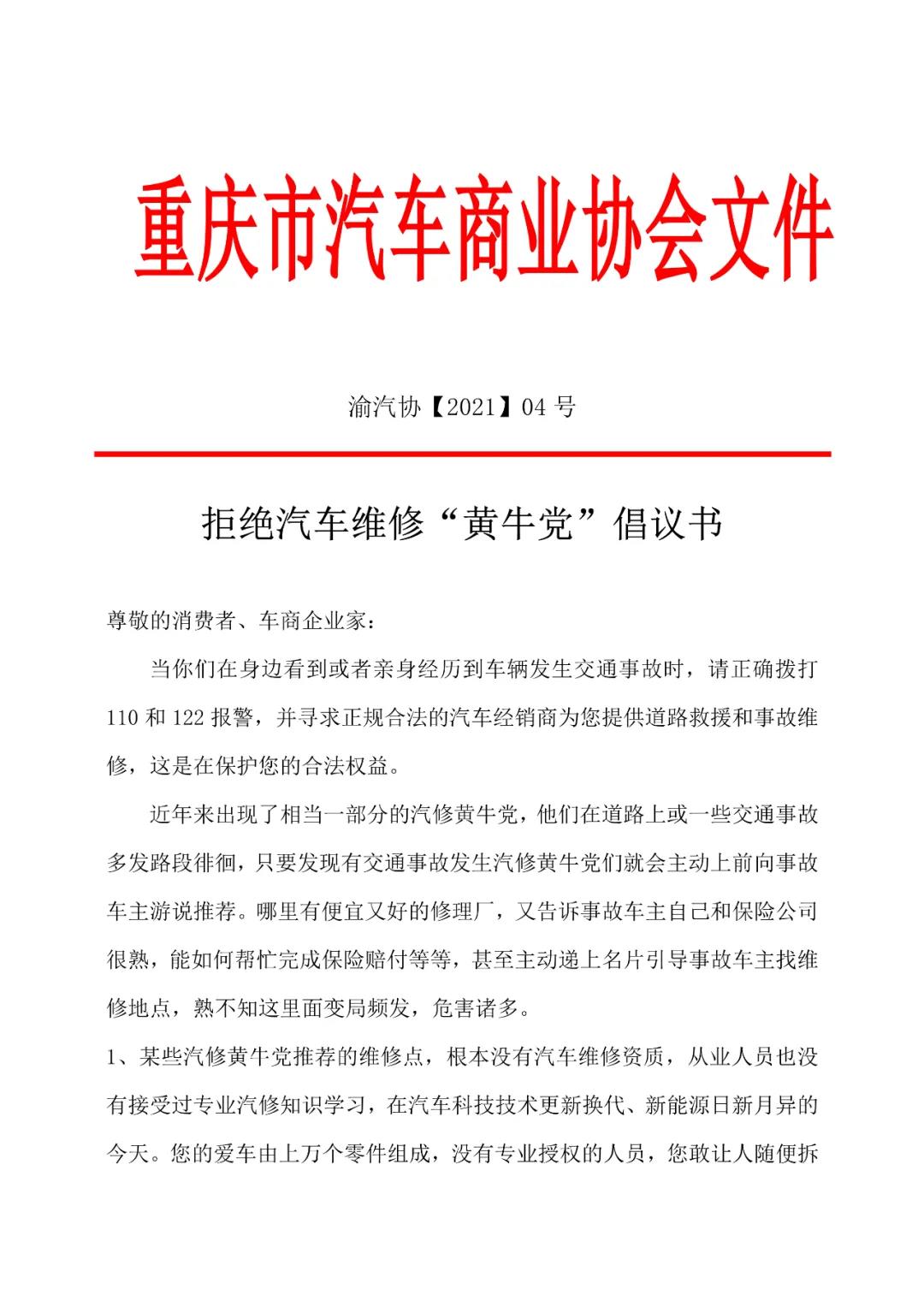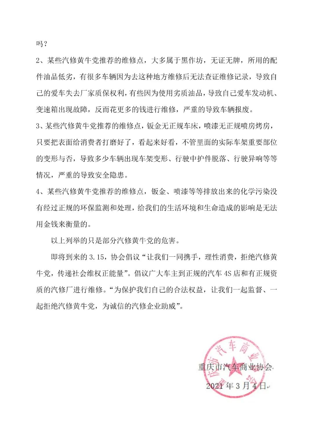 2021年3月4日,重庆市汽车商业协会发布拒绝汽车维修“黄牛党”倡议书。