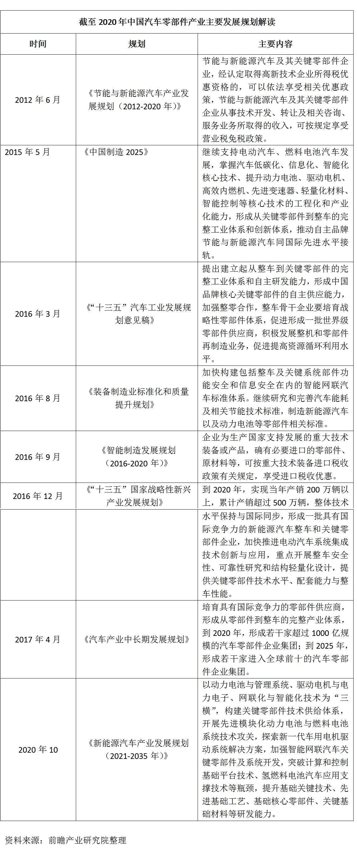 为促进我国汽车零部件行业积极健康发展,近年来我国相关部门颁布了行业相关政策发展规划。2016年12月7日,工业和信息化部、财政部联合发布了《智能制造发展规划(2016-2020年)》,提到企业为生产国家支持发展的重大技术装备或产品,确有必要进口的零部件、原材料等,可按重大技术装备进口税收政策有关规定,享受进口税收优惠。