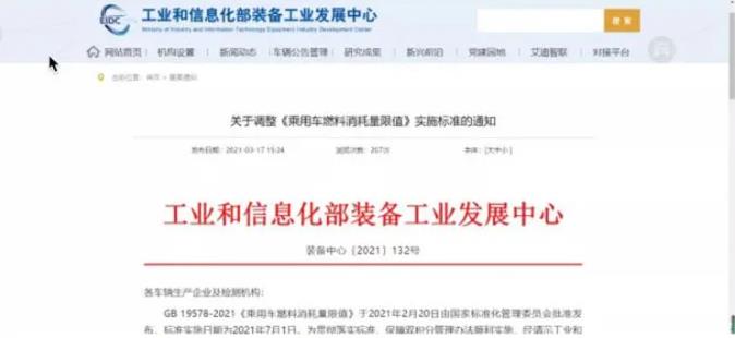 日前,工业和信息化部装备工业发展中心发布关于调整《乘用车燃料消耗量限值》实施标准的通知,具体如下: