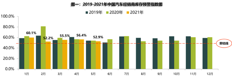 2021年6月1日,中国汽车流通协会发布的 “中国汽车经销商库存预警指数调查”显示,2021年5月汽车经销商库存预警指数为52.9%,同比、环比双降,分别下降1.3和3.5个百分点,库存预警指数位于荣枯线之上。