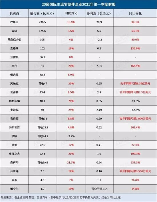 据第一季度财报,在整体上,国际主流零部件供应商在销售额和净利润等方面表现良好。其中,天纳克、博格华纳、安波福、奥托立夫和森萨塔等营收增幅均超过了20%;李尔、奥托立夫、麦格纳、海斯坦普和森萨塔净利润增长更是达到了三位数。