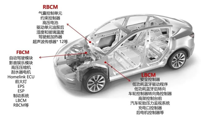 为了解决这个问题,特斯拉推出了新一代电子电气架构。它革命性地将分散的电子控制单元集中在一起,形成了CCM(一个电脑)+三大区控制器的电子电气架构。不仅大大提高了汽车的自动化程度,还将传统汽车长达数公里的线束缩短到了100米,大幅缩减了汽车成本。