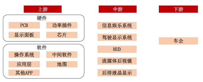 智能座舱产业链可分为上游、中游、下游三个环节。上游环节可分为硬件和软件部分,硬件部分主要包括功率插件、显示面板、PCB以及芯片等,软件部分包括底层操作系统,基于操作系统能够衍生出部分中间软件、其他APP等。中游环节同样可分为硬件和软件,软硬件结合形成完整的控制和显示系统。中游的零部件最后集成到下游的整车上,形成完整的智能座舱系统。