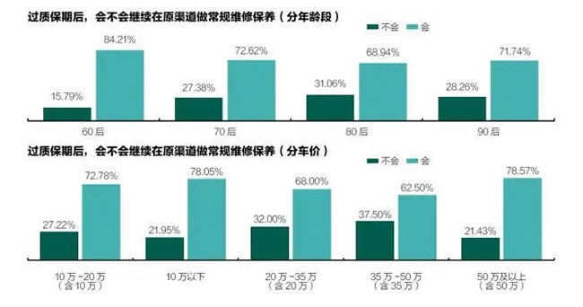 本次调查涉及的是汽车维修保养、汽车精品、汽车美容及汽车改装这四大类后市场服务。调查显示,质保期外,56.8%的受访者选择去4S店体系外的渠道做维修保养,60后和豪华车主对渠道的“忠诚度”最高;64%的受访者选择在电商平台上选购汽车精品,其中以80后、90后占比最高;56%的受访者每年在汽车美容上的花费在1千元以下;11%的受访者做过汽车改装项目。