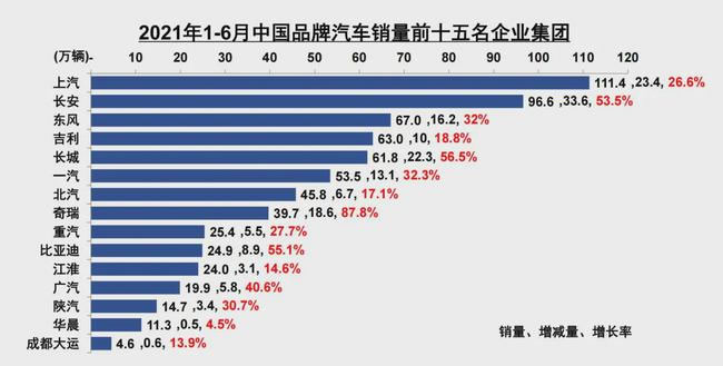 根据中国汽车工业协会(以下简称“中汽协)最新发布的数据显示,在1-6月份中国品牌汽车销量前十五名企业集团中,奇瑞集团以39.7万辆(不含合资)、87.8%的增长率,增速排名第一。这是继1-5月份增速位居行业第一之后,奇瑞集团增速再居第一,且远超行业25.6%的平均增速。