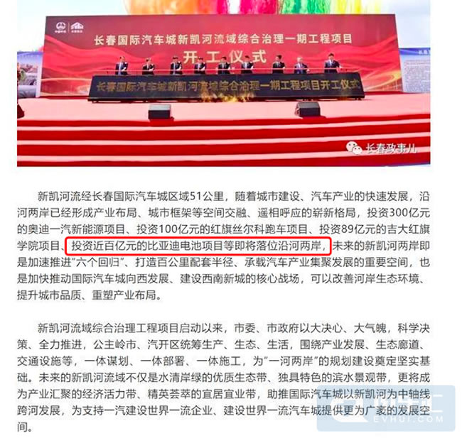 而在今年5月29日,同样是长春官方媒体发文称,长春国际汽车城新凯河综合治理一期工程项目顺利启动,文中提到投资近百亿的比亚迪电池项目即将落位新凯河沿岸。与比亚迪电池项目一同落位的还有投资300亿的奥迪一汽新能源项目、投资100亿的红旗丝尔科跑车项目、投资89亿的吉大红旗学院项目。