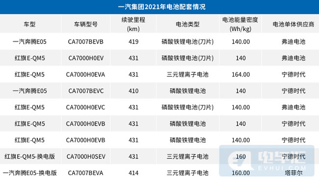 根据电车汇数据智库对新能源汽车推荐目录的统计,一汽集团申报的新能源汽车电池供应商包含宁德时代、孚能科技、亿鹏能源、塔菲尔、力神、桑顿新能源、星恒电源,其中配套车型最多的是宁德时代。
