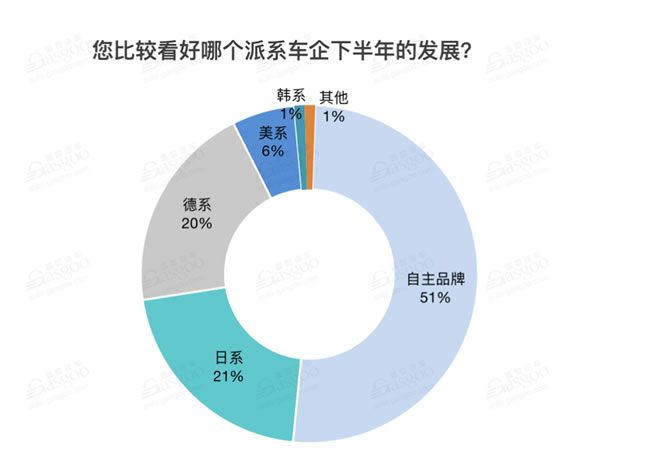 在本次调研中,超50%的参与者看好自主品牌未来的发展。与此同时,日系和德系品牌亦得到不少支持,美系和韩系认可度降低。