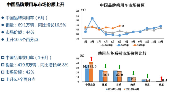 从上半年市场表现看,各大车企相较去年同期均有所上涨,自主品牌表现尤为亮眼,如长城汽车同比增幅达56.5%,比亚迪达55.1%。从市场份额看,中国品牌乘用车前半年达到42%,同比上升5.7%。