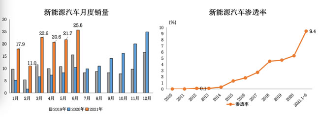 从上半年数据来看,新能源汽车可以说是取得飞跃式增长,产销分别完成121.5万辆和120.6万辆,同比均增长2倍,目前新能源汽车累计销量已与2019年全年水平持平。