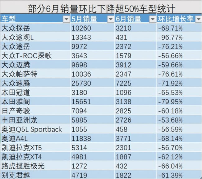具体来看,环比跌幅高达96.77%的大众途观L最令人诧异,销量直接从5月的五位数跌成了三位数,而同为万辆俱乐部常客的本田雅阁、大众探岳、奥迪A4L等亦分别出现79.95%、68.71%以及68.14%的环比跌幅。