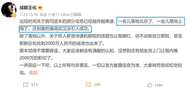 事实上,最近一段时间,围绕小米“落户地”的消息时常传出,北京、上海、武汉等城市均成为“绯闻目标”。为此,小米公关部王化发文回应称:“近段时间关于我司造车的部分信息已经越传越离谱,一会儿落地北京了、一会儿落地上海了、还刻意的强调武汉没引入成功。”虽然未置可否,但似乎侧面否认了这几个城市的可能性。