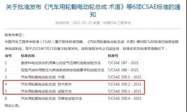 近日,中国汽车工程学会(CSAE)正式批准发布了由杭州亚太依拉菲动力技术有限公司)牵头编写的国内首个轮毂电机行业性标准。该系列标准包括术语、技术条件、试验方法和可靠性试验方法四个部分。定出轮毂电机产品的关键技术指标和创新性指标,并创新性地提出了轮毂电机试验方法,填补了国内外行业空白,为轮毂电机的高标准发展提供了方向。