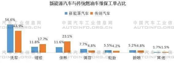 而且,新能源汽车的维修和保养工单比例远远低于传统燃油汽车,但在洗车、美容、轮胎、钣喷业务的工单比例更高。这表明新能源汽车相对传统汽车而言具有维修、保养频率低的特点。