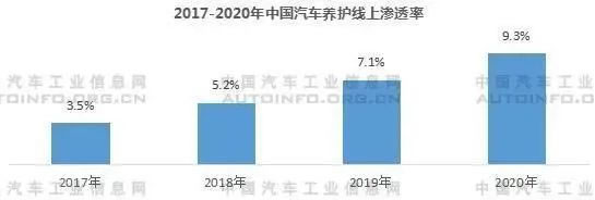 2020年中国汽车养护市场线上渗透率达到9.3%,随着中国O2O商业模式的快速兴起,未来汽车后市场维修保养线上渗透率有望实现快速增长。